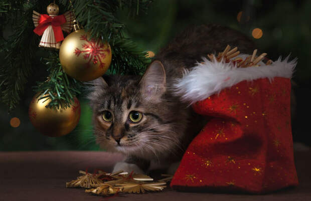 Сдуру он запрыгнул почти на самую макушку. Центр тяжести сместился и в мгновенье ока праздничное дерево рухнуло на пол под веселый звон разбившихся шаров.