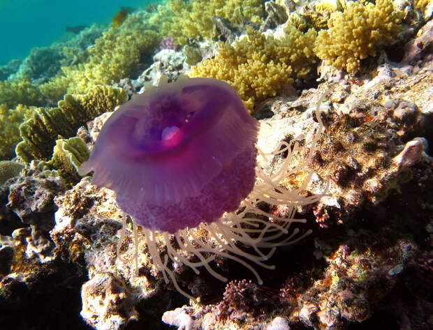 Еще одно удивительное родство. Оба этих существа относятся к группе стрекающих, или книдарий: так называют животных, обладающих «жалящими» стрекательными клетками, которые они используют как для охоты, так и для защиты от врагов. Кроме того, у медузы и коралла схожее строение тел: все книдарии представляют собой мешкообразные создания с расположенным по центру отверстием (для еды и вывода экскрементов одновременно), вокруг которого расположены щупальца.
