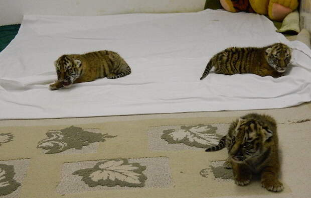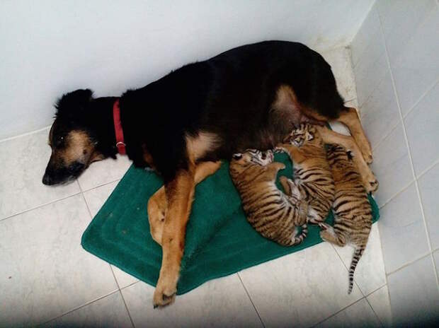 Правда особой радости новоиспеченным родителям такое прибавление в семействе не принесло. Они, собственно, и не собирались нарушать свой привычный уклад жизни. Мать отпихнула от себя пищащих комочков, отвернулась, широко разинув пасть, зевнула и заснула. А полосатики так и остались голодными. К счастью, сотрудники зоопарка к такому исходу событий были уже готовы. Практически все местные хищники породы кошачьих отказываются от своих детей. Да и сама Багира два года назад наотрез отказалась кормить малышей. Тогда пришлось экстренно искать собаку, которая сможет снабдить тигрят молоком. Помогла бельгийская овчарка. В этот раз ветеринары решили подстраховаться и заранее найти кормилицу.