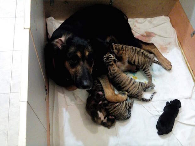 Обратились в сочинский приют для животных, где как раз в это же время ощенилась собака. Дворняга Изи оказалась посговорчивее. И отправилась в зоопарк к тигрятам.