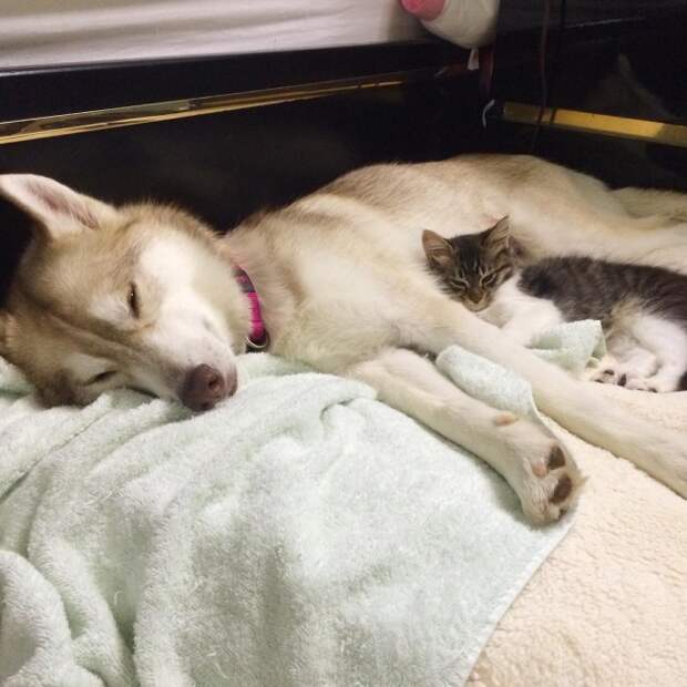 Когда котенка Рози нашли, он был на грани смерти. Но сибирский хаски Лило воспринял его как своего щенка и вернул малыша к жизни. Трехнедельный котенок и его новая мама подружились моментально, и через неделю Рози было не узнать.